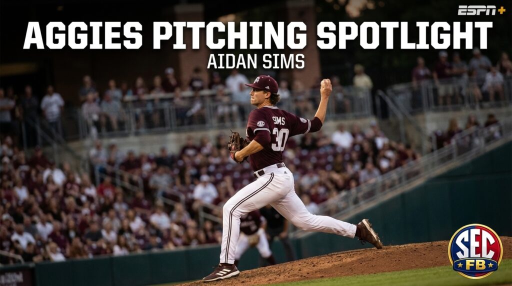 Aidan Sims SEC Pitcher of the Week headlines this week’s Aggies spotlight after a dominant outing. Sims fired a seven-inning complete-game shutout against Vanderbilt, and the crowd in Forney celebrated loudly. He threw 117 pitches, struck out eight, and yielded only three hits. Because he walked two, his command still faced traffic, yet he limited damage when it mattered. This victory was his sixth of the season and his third straight quality start.