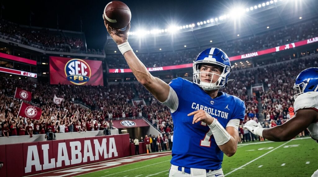 Alabama’s offer to CJ Cypher signals the program’s investment in long-term quarterback depth. At 6-foot-3 and 195 pounds, the Carrollton High School freshman blends size and mobility. During the 2025 season he threw for 2,178 yards and 26 touchdowns with only three interceptions, and coaches praised his pocket feel and decision making.
