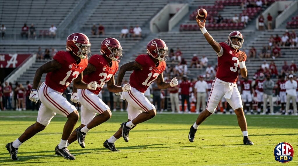 Because Alabama runs a three-receiver set, opportunities will remain plentiful. Coaching emphasizes separation, contested catches, and yards after contact. Therefore the receiving room projects as deep and ready to produce. Fans should expect growth, competition, and high-upside performances this season. Spring practice and fall camp will reveal pecking order and chemistry. Coaches will tailor routes to maximize speed and catch points. As a result, deep shots and intermediate windows could open consistently.