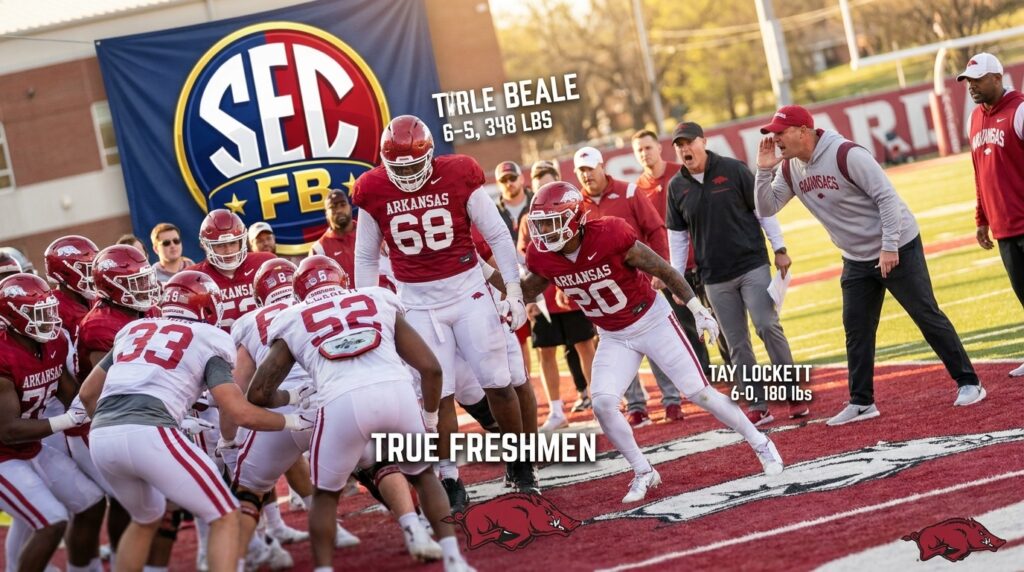 Arkansas football true freshmen Beale and Lockett making an impact on the Razorbacks’ defense is already a spring storyline. Coaches praise their instincts and work ethic, and they note progress in positional drills. However, staff point to consistency concerns before awarding significant reps early. Still, the early spring depth chart shows Beale taking meaningful snaps at interior defensive line against first team offensive looks while coaches rotate veterans and transfers, and Lockett has made several attention grabbing plays in the secondary, including a timely takeaway during a two minute drill and a forceful strip near the goal line that led to a recovery, so as practices continue both players will face sharper evaluation in team scrimmages, in coach led walkthroughs and in position specific work where technique, play recognition and stamina will determine who climbs the two deep and who settles into rotational roles for the opener on September 5.