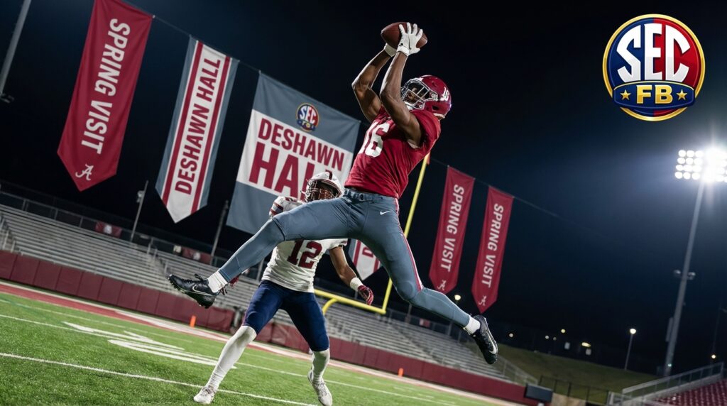 Deshawn Hall recruitment and spring visit slate (2027 four-star Prattville WR) stands out because of his rare size. The 6-foot-6, 4-star wide receiver from Prattville High School draws attention for his catch radius and vertical ability. Because he stands 6-foot-6 and moves like a receiver, scouts are excited. He listed multiple spring visits and plans to visit Alabama, Auburn, Clemson, Georgia and others. Moreover, Hall told reporters he will get to Georgia, Tennessee, Michigan, Penn State and Clemson. As a result his recruiting calendar will heat up this spring.