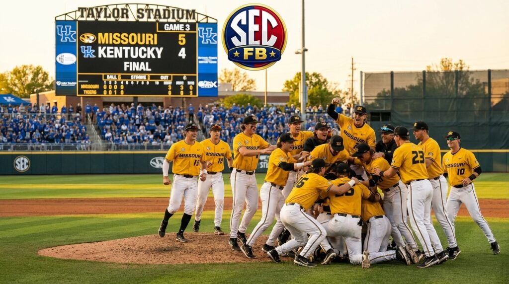 Missouri baseball series win over No. 24 Kentucky marked a program-defining moment in Lexington on April 5. The Tigers stunned the Wildcats and seized a statement series victory. Mizzou played with poise and power across three games. In Game 1 they produced 11 hits and claimed a 5-4 decision. However, Kentucky roared back in Game 2 with a 9-2 showing that pushed the matchup to a decisive third game. As a result, the finale felt electric at Taylor Stadium and tensions ran high.